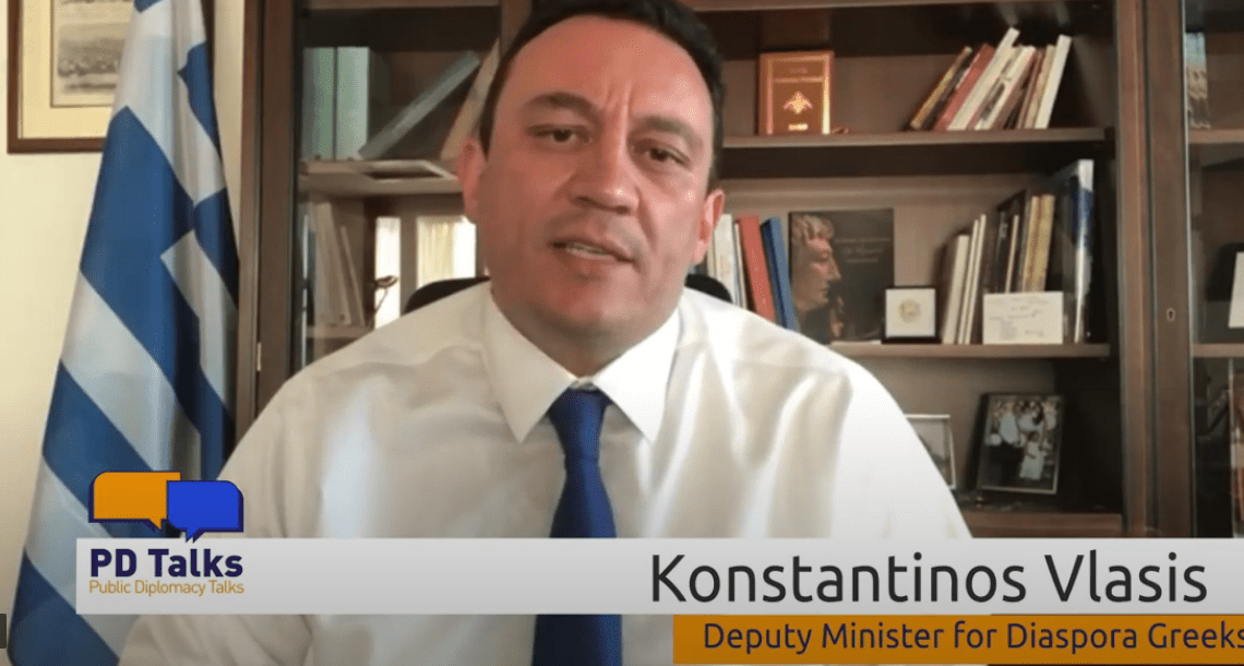 Ο Υφυπουργός Εξωτερικών κ. Κώστας Βλάσης απηύθυνε χαιρετισμό στη διαδικτυακή συζήτηση με θέμα “Turning the Tide: How to reverse a negative image – The case of Greece”. Η διαδικτυακή συζήτηση, διοργανώθηκε στο πλαίσιο του πρώτου PD Talks  – Public Diplomacy Talks του forum που εγκαινιάζει η Γενική Γραμματεία Δημόσιας Διπλωματίας του Υπουργείου Εξωτερικών, με βασικό αντικείμενο την ανταλλαγή απόψεων και βέλτιστων πρακτικών αναφορικά με τις σύγχρονες εξελίξεις στον τομέα της δημόσιας διπλωματίας.